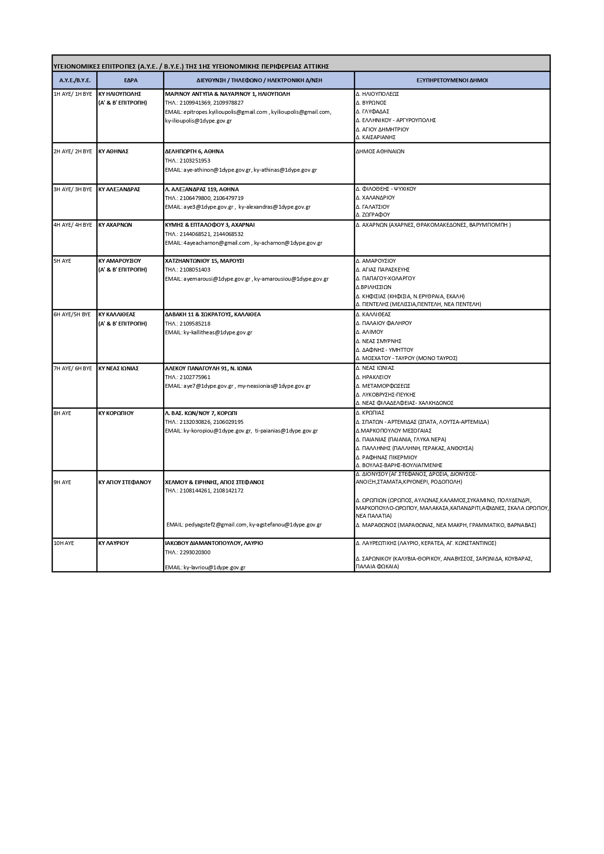Με την υπ’ αριθμ. Α1β/Γ.Π. 50556/ 28-9-2022 (ΑΔΑ: ΨΣΟΓ465ΦΥΟ-ΝΣ5) Απόφαση Αναπληρώτριας Υπουργού Υγείας συγκροτήθηκαν και ορίστηκαν τα μέλη στις Πρωτοβάθμιες & Δευτεροβάθμιες Υγειονομικές Επιτροπές (ΑΥΕ και ΒΥΕ) της 1ης Υγειονομικής Περιφέρειας Αττικής. Η εν λόγω απόφαση τροποποιήθηκε με την υπ’ αριθμ. Α1β/Γ.Π. 58209/9-12-2022 (ΑΔΑ: 6ΒΡ3465ΦΥΟ-ΧΘΥ) 1η Τροποποίηση Απόφασης , με θέμα: «Συγκρότηση και ορισμός μελών στις Πρωτοβάθμιες και Δευτεροβάθμιες Υγειονομικές Επιτροπές (Α.Υ.Ε. και Β.Υ.Ε) της 1ης Υγειονομικής Περιφέρειας Αττικής». Οι ανωτέρω Υγειονομικές Επιτροπές είναι αρμόδιες να αποφαίνονται για θέματα υγείας υπαλλήλων, να γνωματεύουν δηλαδή επί αναρρωτικών αδειών Νομικών Προσώπων Δημοσίου Δικαίου Δημοσίου, οι οποίοι διατήρησαν την υγειονομική ασφάλιση του Ι.Κ.Α., υπαλλήλων με σχέση εργασίας Ιδιωτικού Δικαίου Αορίστου Χρόνου, αλλά και επί αναρρωτικών αδειών των εργαζομένων στον ιδιωτικό τομέα. Οι Δ/νσεις Προσωπικού και οι εργαζόμενοι μπορούν να απευθύνονται στην Υγειονομική Επιτροπή ανάλογα με την έδρα (Δήμο) του ασθενούς, σύμφωνα με τον κάτωθι Πίνακα: