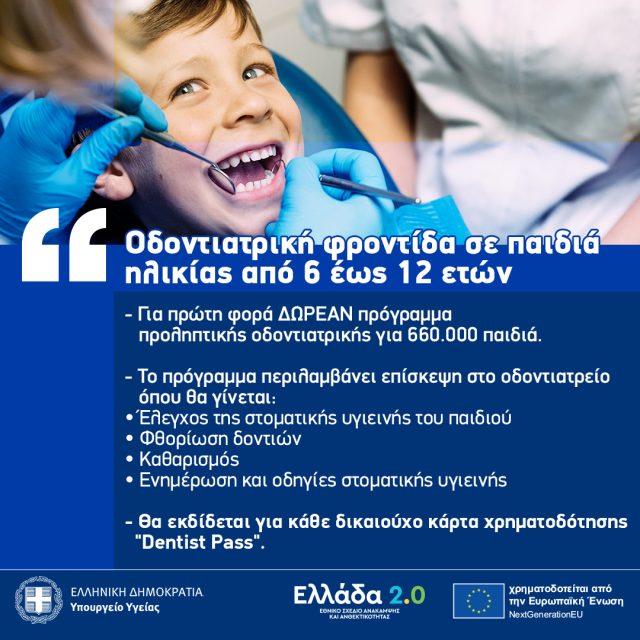 Ειδικότερα στο πλαίσιο του έργου «Υλοποίηση Εθνικού Προγράμματος Πρόληψης της Δημόσιας Υγείας «Σπύρος Δοξιάδης» », του Ταμείου Ανάκαμψης και Ανθεκτικότητας Ελλάδα 2.Ο. προσφέρεται δωρεάν σε παιδιά από 6 ως 12 ετών προληπτική οδοντιατρική φροντίδα μέσω του dentist pass.
