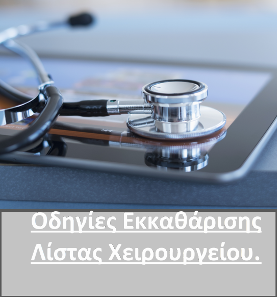 • Οδηγίες Εκκαθάρισης Λίστας ΧειρουργείουPosted on: 06 Nov 2023 Οδηγίες Εκκαθάρισης Λίστας Χειρουργείου Previous Προκήρυξη θέσεων ειδικευμένων ιατρών και οδοντιάτρων του κλάδου Ε.Σ.Υ. (Yπ’ αριθμ Γ4α/Γ.Π.οικ:14830/08-03-2023) – ΕΣΩΤΕΡΙΚΗΣ ΠΑΘΟΛΟΓΙΑΣ Π.Φ.Υ.Next Συνέντευξη Τύπου του Υπουργού και του Υφυπουργού Υγείας για την αντιμετώπιση της … Skip back to main navigation