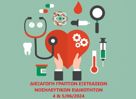 Ανακοίνωση – Διεξαγωγή Γραπτών Εξετάσεων, Περιόδου Ιουνίου 2024, Υποψηφίων Ειδικευομένων Νοσηλευτών, για την Απόκτηση του Τίτλου των Νοσηλευτικών Ειδικοτήτων της «Επείγουσας και Εντατικής Νοσηλευτικής», της «Νοσηλευτικής Δημόσιας Υγείας/Κοινοτικής Νοσηλευτικής», της «Νοσηλευτικής Ψυχικής Υγείας», της «Ανακουφιστικής και Υποστηρικτικής Νοσηλευτικής Φροντίδας», της «Νοσηλευτικής Καρδιαγγειακών Παθήσεων», της «Ογκολογικής Νοσηλευτικής», της «Νοσηλευτικής Παίδων» και της «Χειρουργικής Νοσηλευτικής» – Αιτήσεις Συμμετοχής από 20/05/2024 έως 31/05/2024.